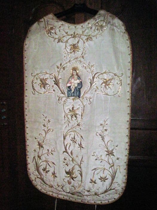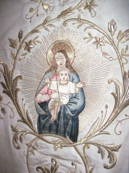 Chasuble, fond gros de Tours crème moiré, broderies guipure or à rinceaux de fleurs de lys formant croix, et encadrant au centre à la face une Vierge à l'Enfant de trois-quart nimbée et rayonnante en broderie passé empiétant polychrome rapportée ; petits trèfles à trois feuilles sur le pourtour ; galon système or, doublure cramoisie.