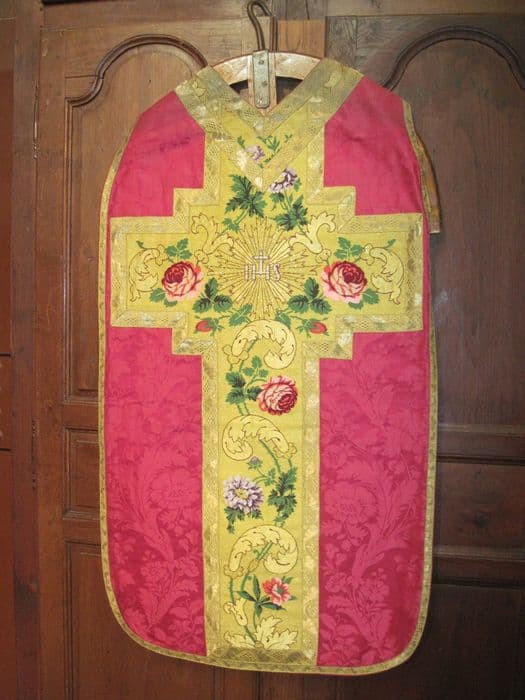 Chasuble d'une chapelle (cf. 0.247 et 0.253) : fond damas à la grenade, croix en lampas de fleurs au naturel, feuillages et grappes de raisins, parements brochés de rosiers au naturel, un galon or.