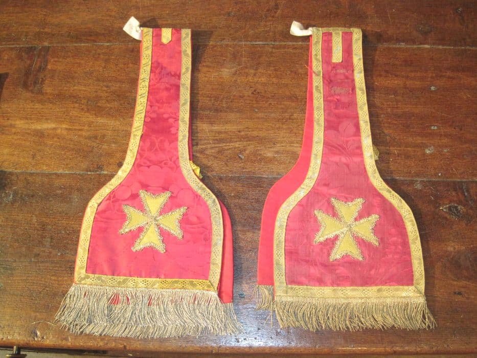 2 manipules identiques, fond damas à la grenade, croix de Malte tissu métallique sur les plats, galon or.