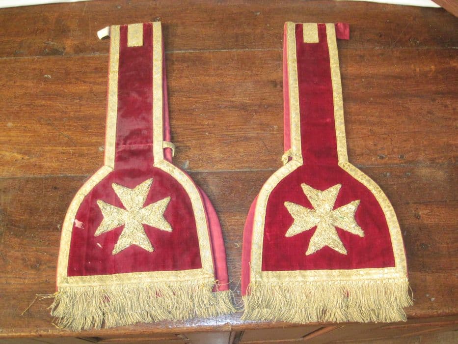 2 manipules, d'un ensemble de 6, fond velours cramoisi, croix de Malte rapportée en lampas fixé par une broderie en crochet de fils métalliques, galon or, franges.