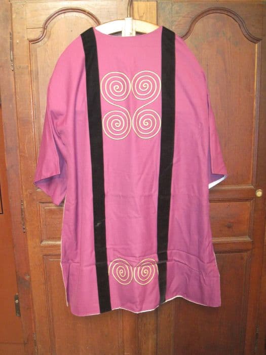 Tissu synthétique. 2 dalmatiques identiques fond violet, galons velours noirs, broderies en forme de spires affrontées.