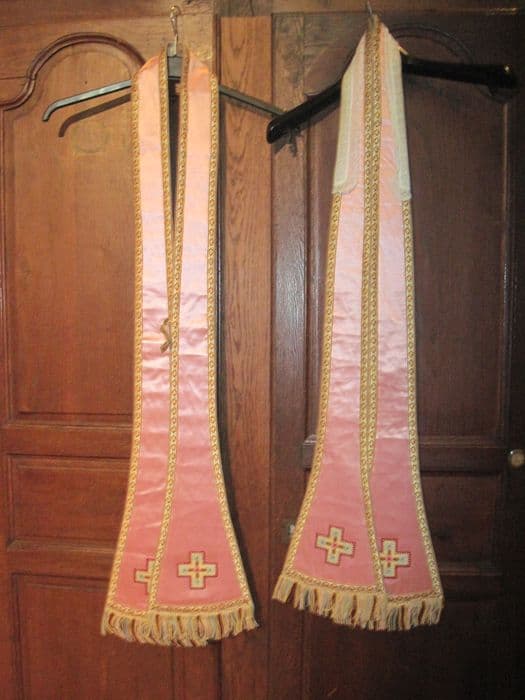 2 étoles identiques à fond rose, croix au canevas polychrome appliquées sur les pâles, galon système, polychrome, franges polychromes, doublure crème.