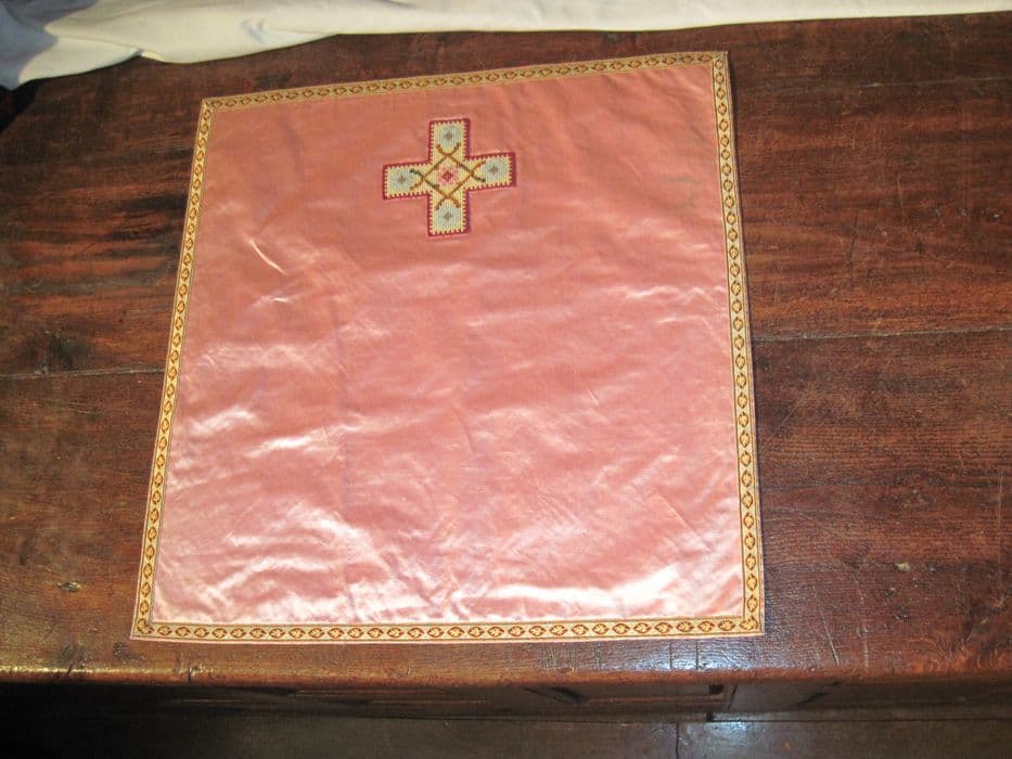 Voile de calice à fond rose, croix au canevas polychrome appliquée, galon système,polychrome, doublure rose.