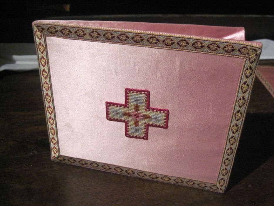 Bourse à fond rose, croix au canevas polychrome appliquée, galon système, polychrome, doublure rose.