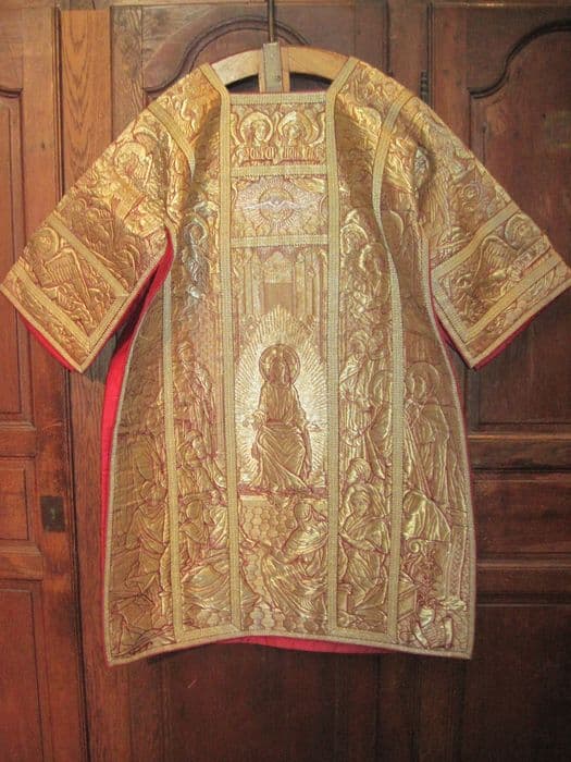 Dalmatique entièrement brochée de fils d'argent doré. Sur l'avers : le Christ en gloire ; sur le revers : la Nativité.