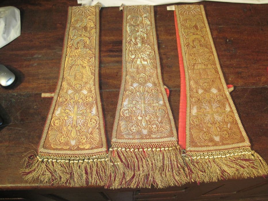 Trois manipules entièrement brochés de fils métalliques or et argent. Motif de concert céleste d'anges, chérubins et séraphins.