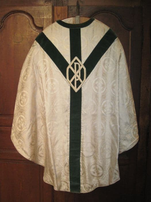 Chasuble fond blanc damassé à motif de croix dans des cercles ; parements en galons de velours vert rejoignant le chrisme