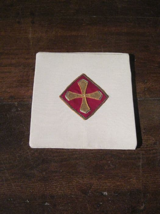 Bourse sur fond crème ; motif de croix en tissu métallisé rapporté sur un fond rouge lui-même rapporté.