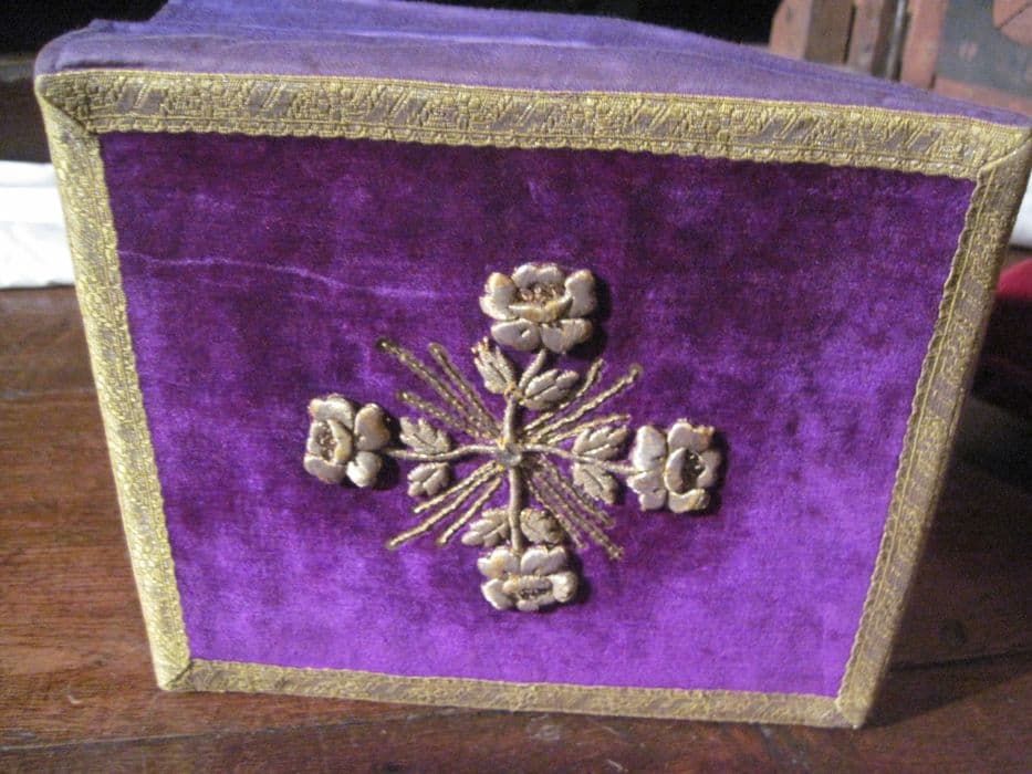 Bourse fond velours violet, ornements floraux guipure fils métalliques or.