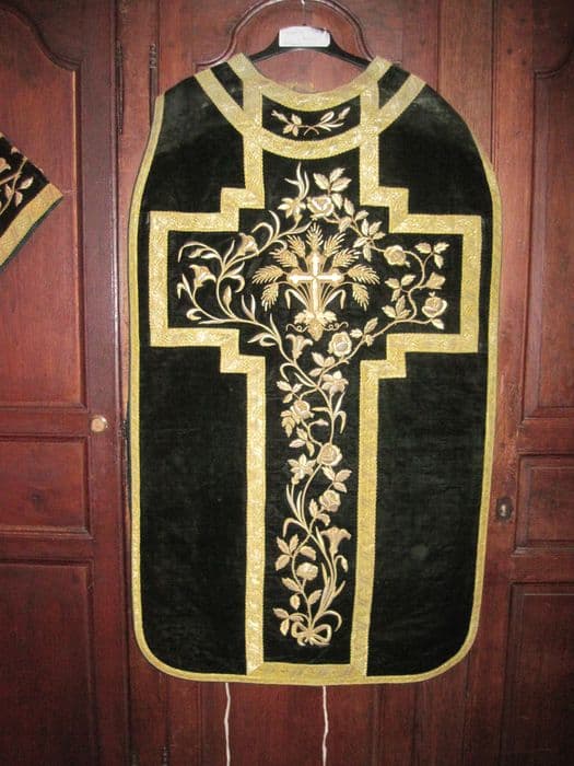 Chasuble fond velours vert, ornements floraux guipure fils métalliques or, motif central à une croix entourée de gerbes de blé.
