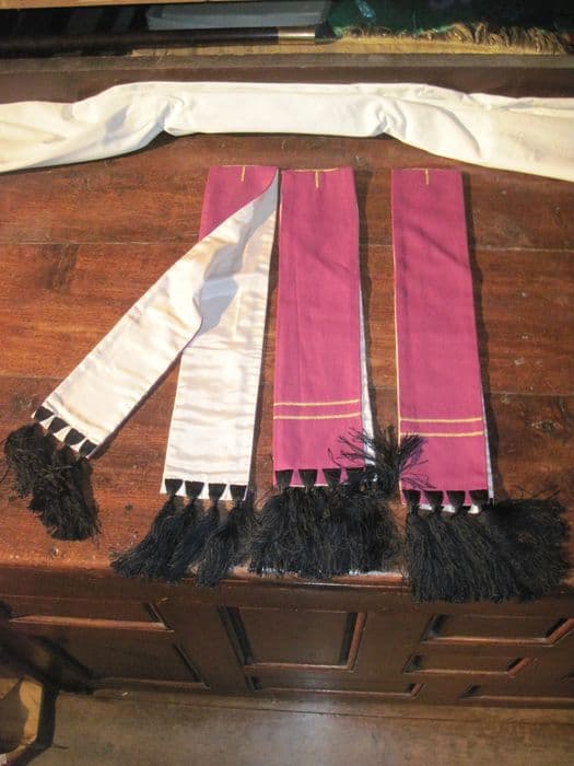 Tissu synthétique. 3 manipules réversibles, 1 face crème, 1 face violet, pompons noirs.