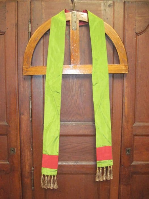 Matière synthétique. Etole fond vert moiré, parements galons rouge, granges or