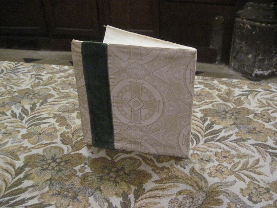 Bourse de corporal fond damassé blanc à motifs de roues encadrant des croix pattées, galon velours vert