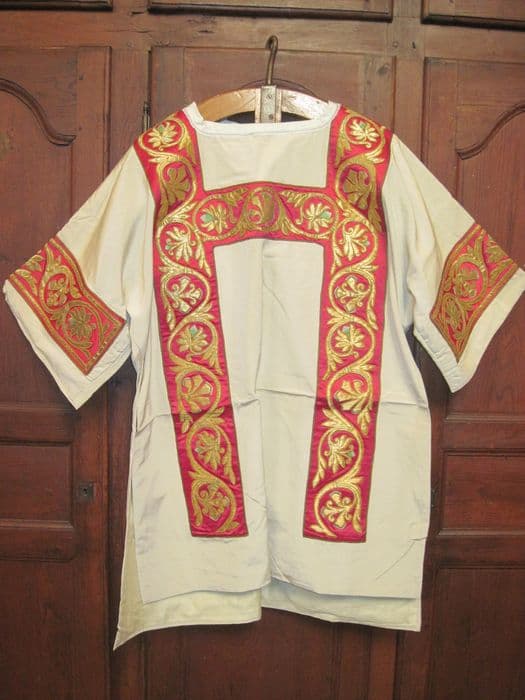 Matière synthétique. Dalmatique fond crème, ornements plaqués de rinceaux or sur fond magenta.