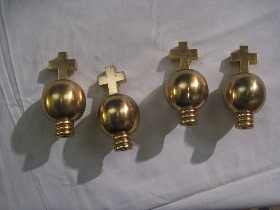4 croix surmontant des sphères ; un trou est ménagé dans leur base pour les fixer. Conservées dans une boîte cartonnée de remploi, avec le parement d'autel décrit fiche 849.