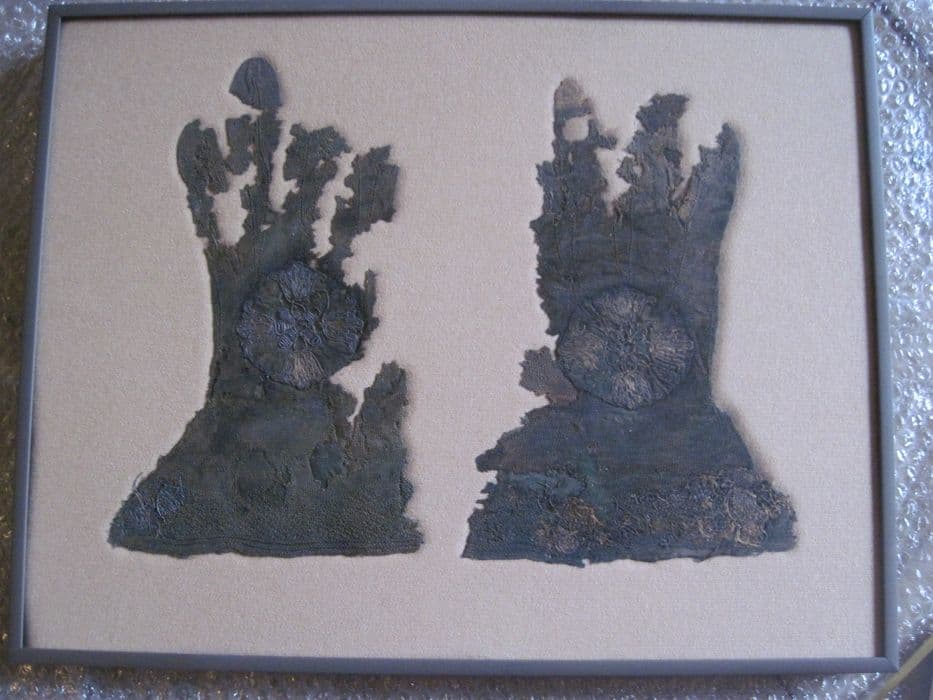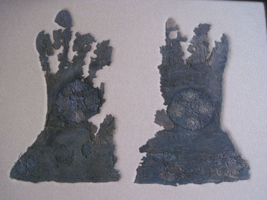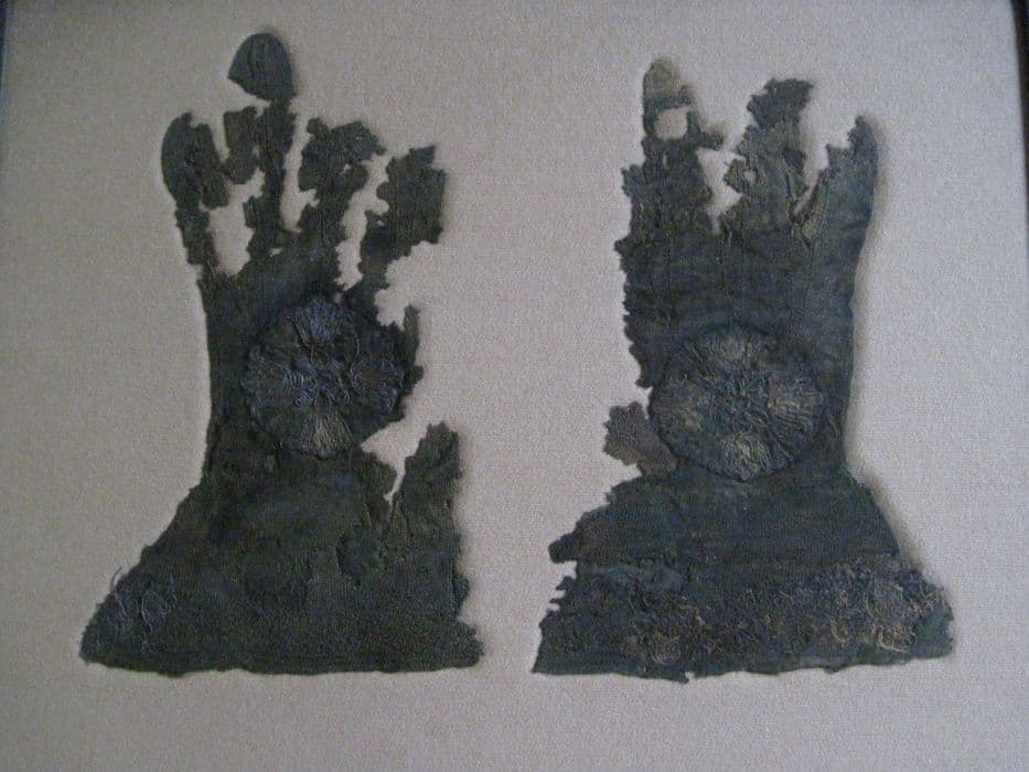 Gants liturgiques à crispin, ornés de médaillons fleuronnés.