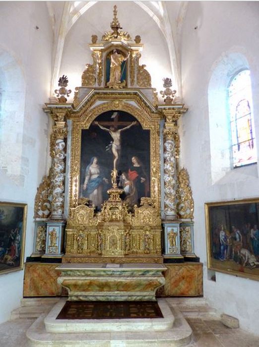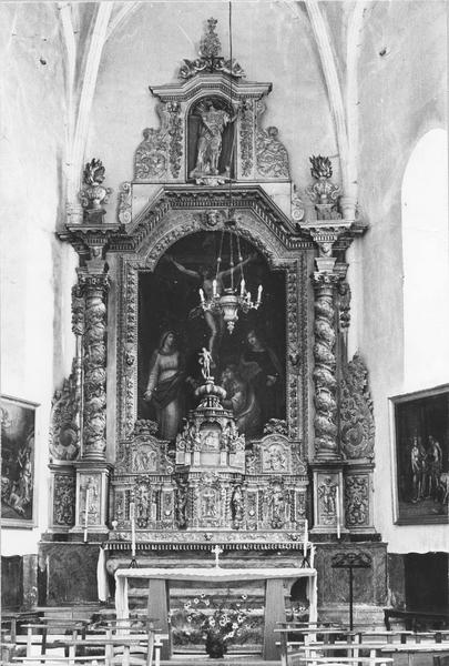 POP | Plateforme ouverte du patrimoineautel, retable (maître-autel) : le Christ en croix, les Apôtres, l'Annonciation, la Visitation, la Résurrection, le Christ tenant le Roseau, le Christ en croix avec la Vierge, saint Jean et la Madeleine, saint Pierre, saint Paul, saint Jean l'évangéliste