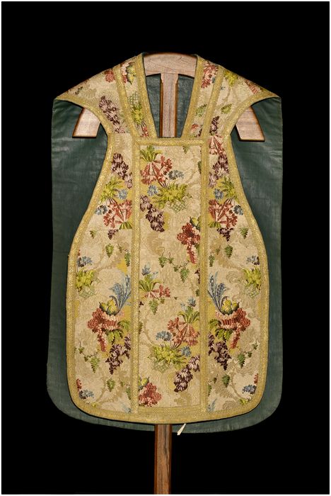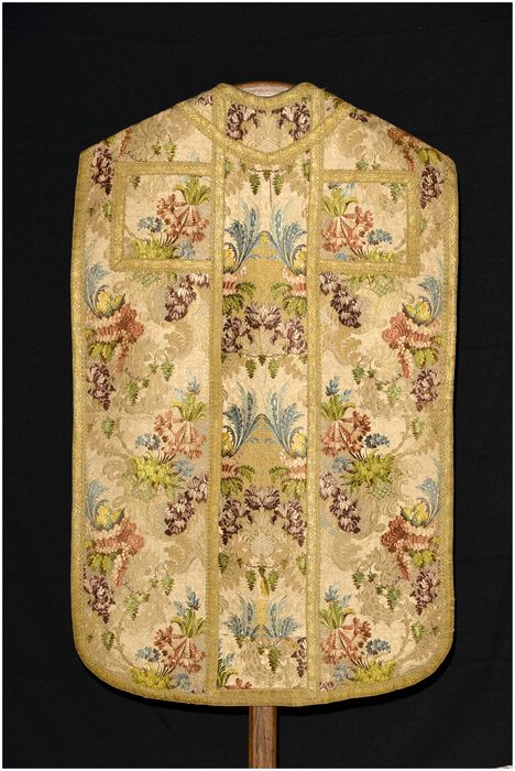 Ornement en damas de soie blanc à décor broché (filé argent et or et fils de soie polychromes) ; broderie en soie jaune apportant un motif de résille. Galon métallique or (contemporain du tissu). Doublure en toile de coton apprêté moiré vert. La doublure de l'étole est en toile de coton vert. Franges en filé métallique or.