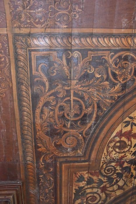 Plafond à l'italienne lambrissé, composé de planches fixées par des clous sur les poutres séparant l'étage des combles.