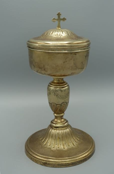 "Ciboire en trois parties en argent doré, au décor repoussé, ciselé et gravé sur le pied, le noeud et le couvercle ; pied circulaire, noeud ovoïde fondu, coupe unie à couvercle emboîtant. Pied à bord droit surmonté d'un corps de moulure délimitant une terrasse presque plate au mamelon central proéminent coiffé de canaux rayonnants d'inégales longueurs et aux contours amatis, motifs que l'on retrouve au centre du couvercle ainsi qu'au culot du noeud où ils