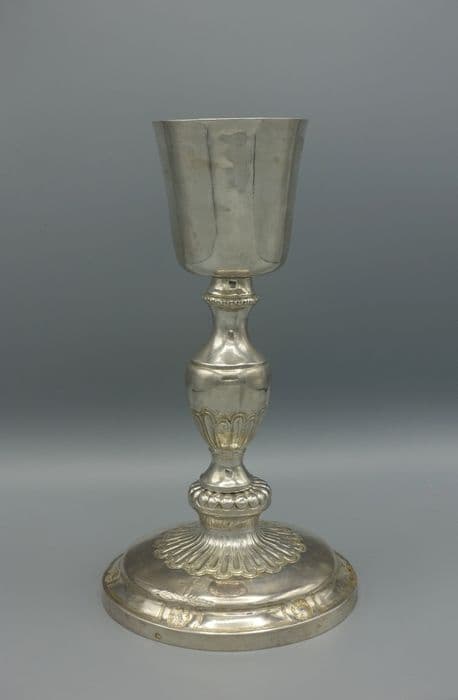 Pied circulaire repoussé et ciselé au profil en talon aplati ; nœud ovoïde fondu et ciselé ; coupe unie. Cavet du pied à six compartiments unis alternant avec six rosaces. Des canaux inégaux à bordure amatie rayonnent à la naissance de la tige, épargnant une large zone unie simplement gravée d'une croix, décor que l'on retrouve au culot du noeud. D'épais godrons animent la large collerette inférieure, tandis que la collerette supérieure, plus fine, est ornée d’oves et entrelacs.