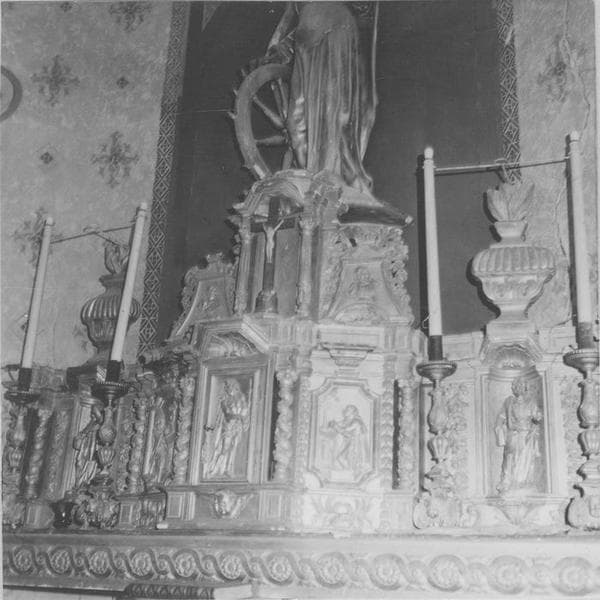 La Cène est représentée sur toute la largeur de la table d'autel. La porte du tabernacle est ornée d'un Christ flagellé et couronné d'épines. Sur les faces latérales du retable, deux bas-reliefs représentant un saint et un évêque non identifiés. De chaque côté, une niche surmontée d'une coquille à l'intérieur desquelles se trouvent à droite un apôtre tenant un livre et à gauche un clerc tenant aussi un livre. Chaque niche est entourée de colonnes torses ornées de pampre et de guirlandes et surmontées d'un pot-à-feu. L'ornementation est complétée par quatre flambeaux en bois dorés à pieds triangulaires ornés d'un angelot sur chaque face. Une statue en bois doré de Sainte-Catherine, patronne de la paroisse, indépendante du retable, surmonte le tout.