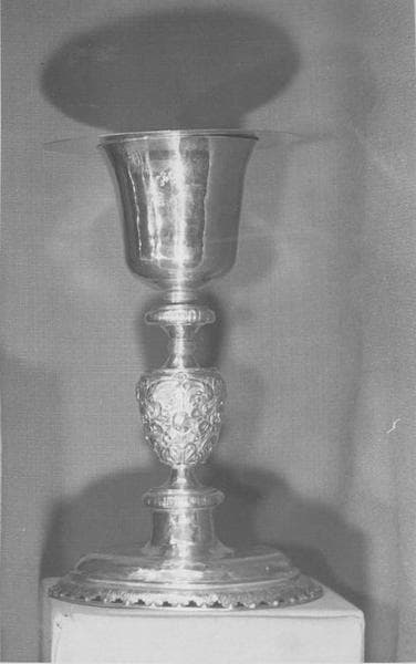 Coupe sans décor. La tige est munie d'un noeud orné de têtes d'anges. Le pied est circulaire, bordé d'une ornementation gravée. Les parties gravées ou repoussées sont dorées.