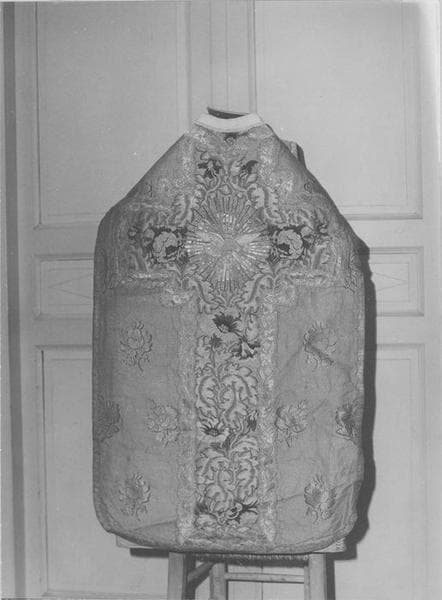 Chasuble rouge, doublée également de rouge. Croix centrale ornée de feuilles d'acanthe, de roses et de gloxinies. Au centre, le Saint-Esprit en fils d'argent sous forme de colombe. La croix est bordée d'une tresse en fils d'or. L'ornementation centrale, feuilles et fleurs, est verte, rose et blanche. Le reste de la chasuble est parsemée de roses.