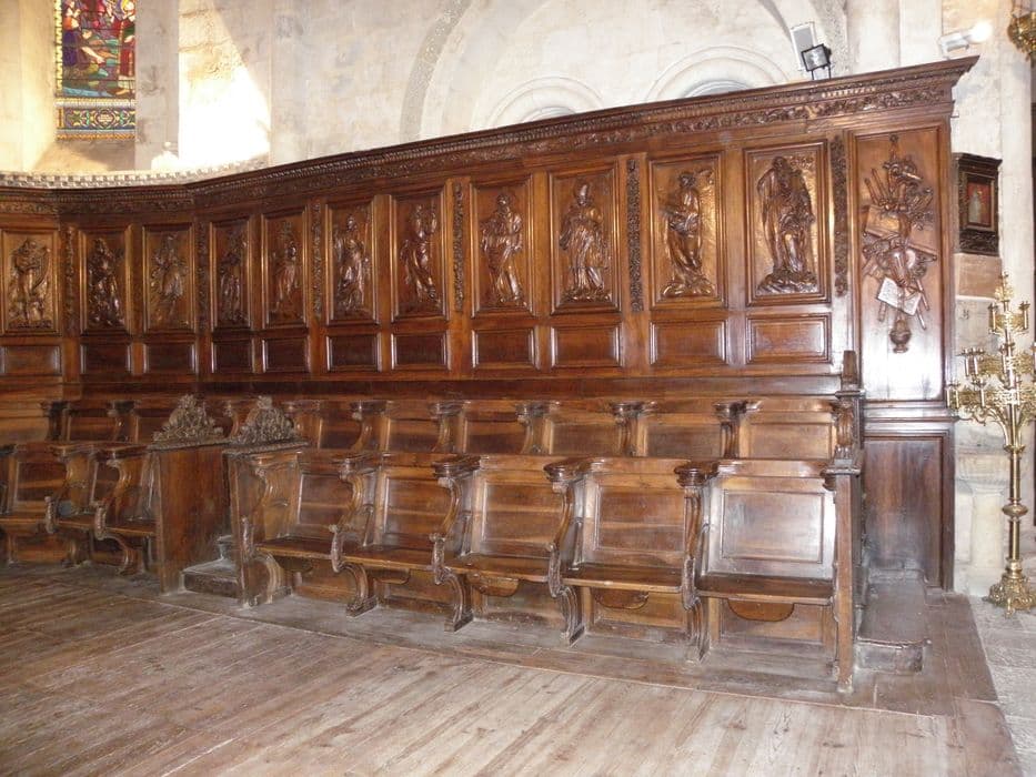 28 stalles hautes plus au centre la stalle de l'abbé et 20 stalles basses. 29 panneaux de lambris de revêtement.