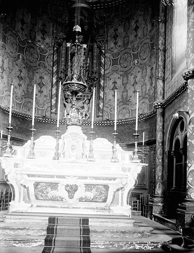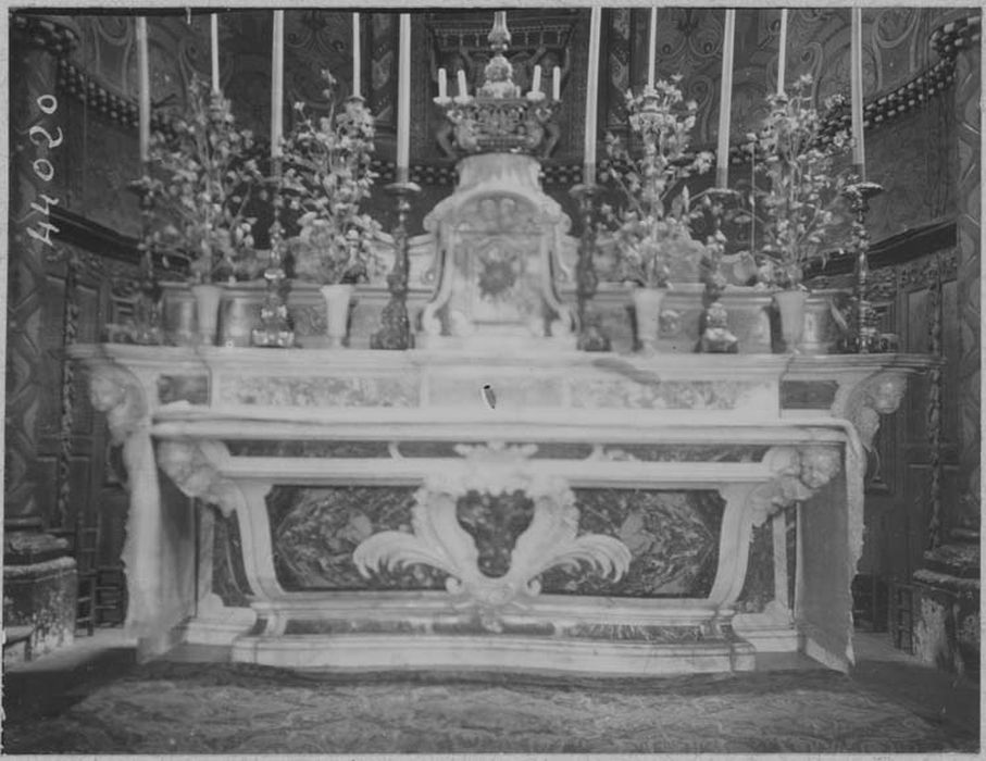 Autel en forme de tombeau, avec au centre un cartouche avec coquille, palmes et aux angles des têtes d'anges ailés.