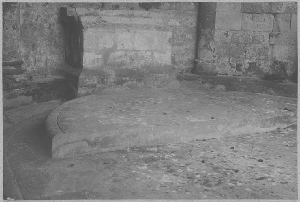 Autel adossé contre la colonne de fond de l'abside et faisant corps avec la maçonnerie. Les parements se composent de cinq assises. Il est en forme de cippe rectangulaire. Un bandeau chamfreiné au sommet, un bandeau tabulé à la base forment sa seule décoration.