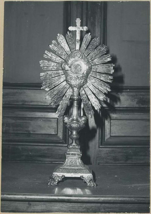 Ostensoir décoré d'épis de blé, têtes d'anges et grappes de raisin. Agneau sur le pied.