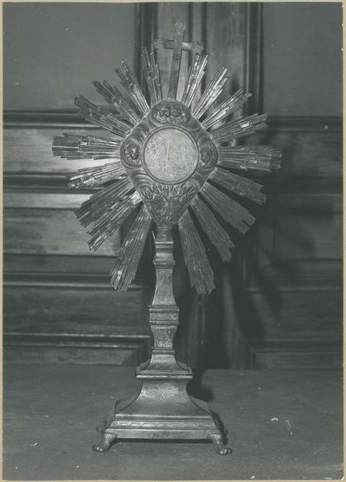 Ostensoir décoré sur le pied d'une figure de la Foi, et de l'agneau pascal sur le socle.