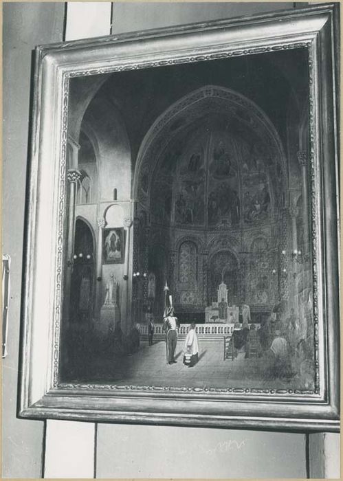 Tableau représentant le choeur de la cathédrale et plusieurs personnages dont un en uniforme.