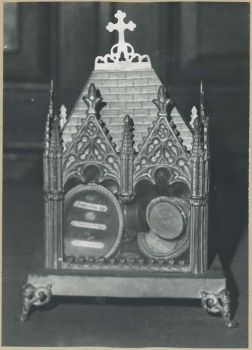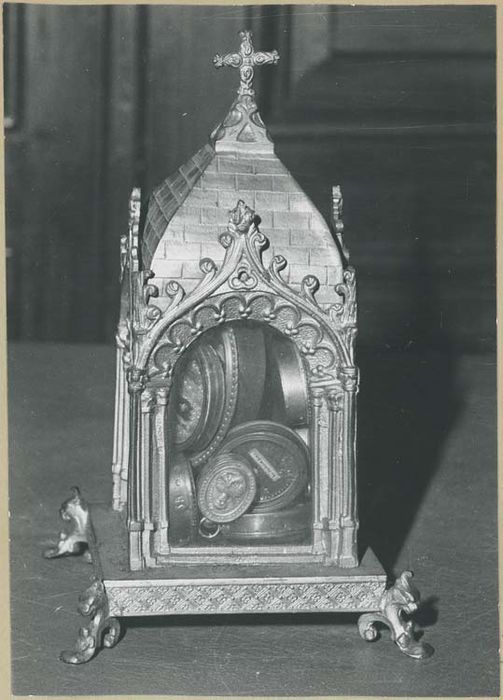 Reliquaires en forme de chapelles gothiques, avec plusieurs médaillons à l'intérieur.