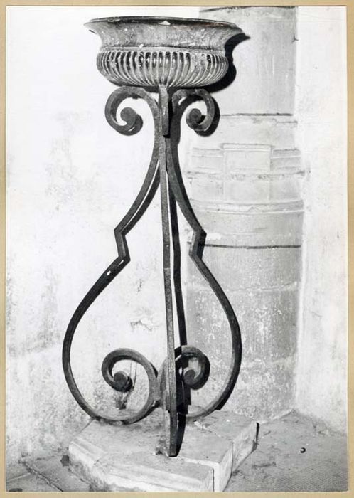 Bénitiers de milieu, vasque circulaire (marbre), piètement tripode (trois volutes en fer forgé). Décor de godrons sur les vasques.