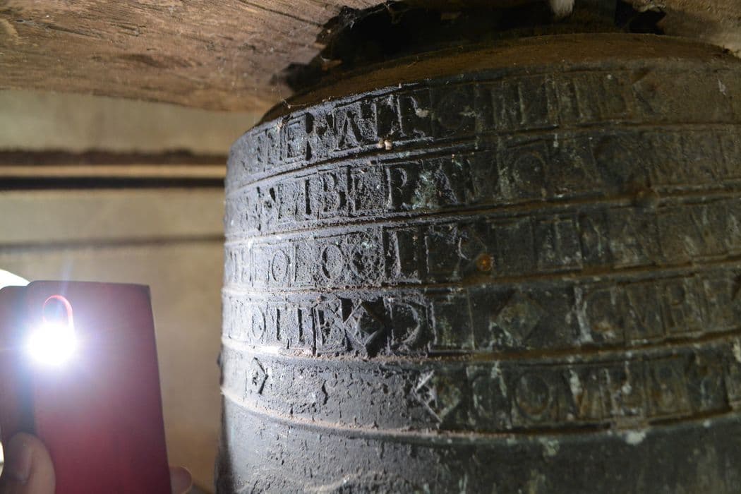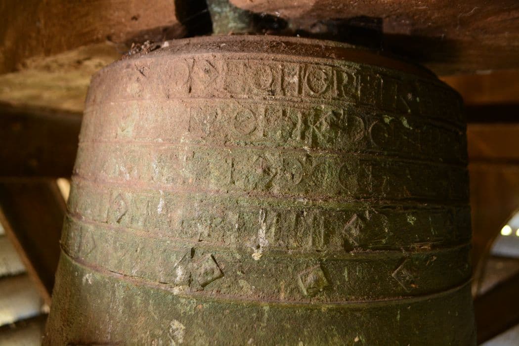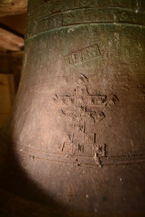 Simples lisérés dans la partie basse du vase. Dans la partie intermédiaire, une croix à deux degrés surmontée de l’inscription disposée en oblique INRI, comportant deux branches horizontales de longueur inégales, la plus basse plus courte. Le dessin est obtenu par la juxtaposition de timbres carrés portant une étoile à huit branches, les extrémités des branches de la croix sont les timbres posés sur l’angle. Mouton avec dispositif d’entraînement, anse insérée dans le joug, battant en acier doux tenu par un baudrier de cuir.