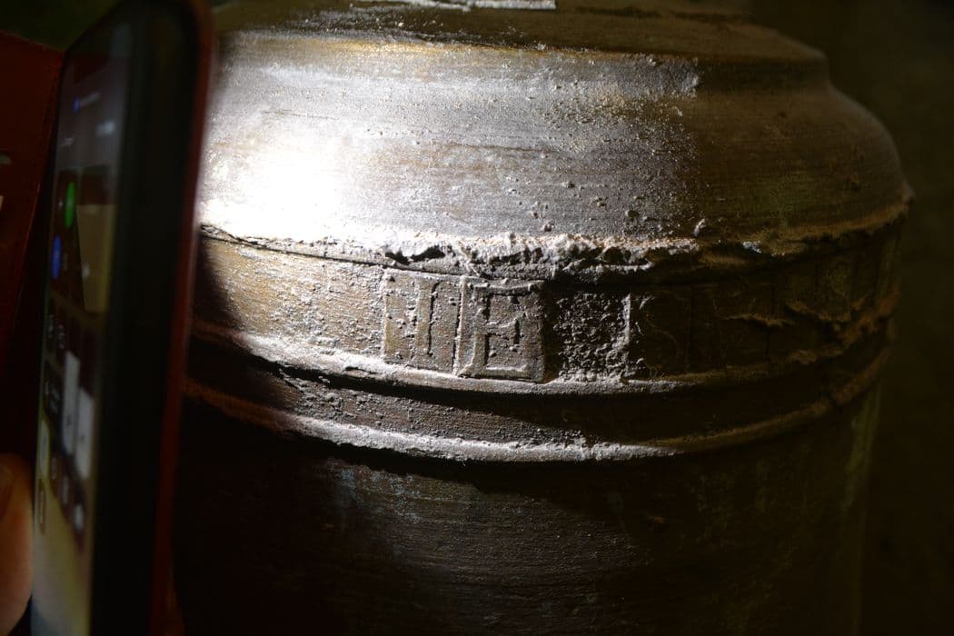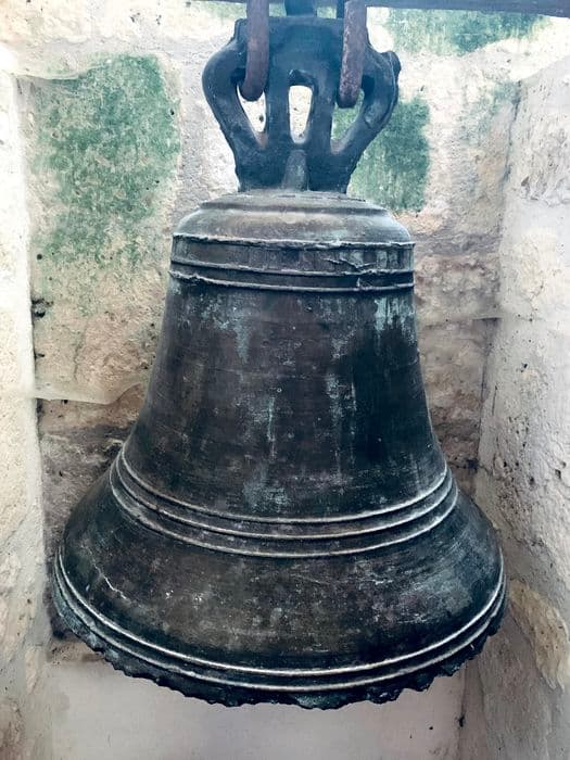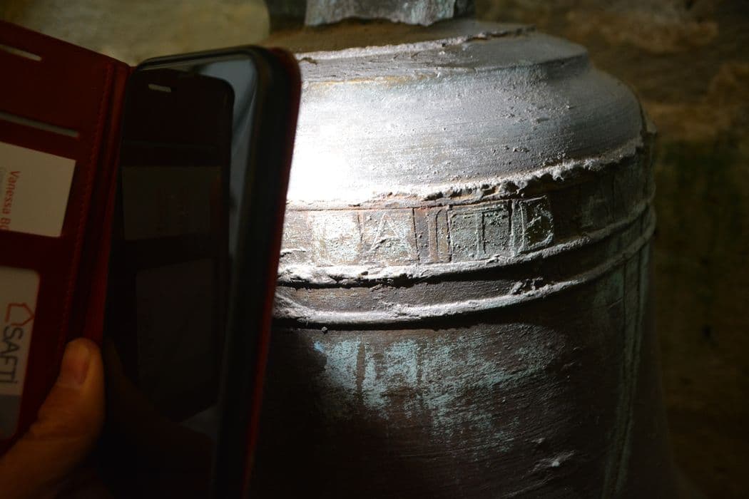 Cloche de profil gothique, fendue, portant une épigraphie dans un bandeau entre deux filets et un troisième au-dessous. Trois filets sur la jupe, deux filets sur la corde. Aucun autre décor, pas de signature, pas de battant.