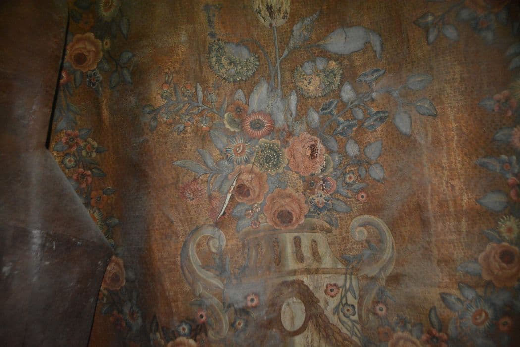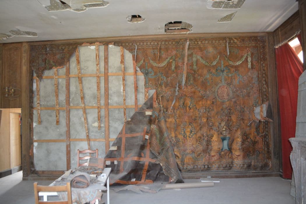 Cuirs dorés ciselés (cuirs ciselés revêtus de dorure à la feuille d’argent, recouvert de vernis jaunes obtenus à partie de résines végétales) et polychromes (peinture à l’huile) avec leurs supports de châssis en bois et leurs bandes de tension auxquels les oeuvres sont fixées. Décor de motifs floraux et végétaux, dans un encadrement de bordures pour chaque panneau (constituées d’anneaux dorés juxtaposés, parfois remplis d’un motif floral), guirlandes, feuillages, rosettes, motifs rocaille, pots à feu, vases, paniers fleuris, piédestaux, métaillons présentant différentes scènes animées de putti. Les dimensions des parties non exposées n’ont pas été prises en raison de la fragilité de l’ensemble des fragments actuellement conservés (protection IMH 2024). La partie exposée représente environ 55 mères carrés.