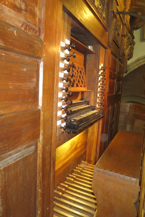 La console, en fenêtre, comporte trois claviers manuels (positif de dos, 9 jeux ; grand orgue, 16 jeux ; récit, 5 jeux) et un pédalier à la française (5 jeux).