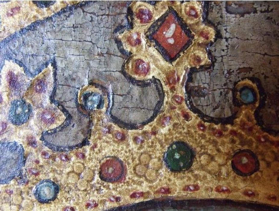 Partie supérieure du panneau de forme triangulaire (2 planches assemblées) ; un cachet de cire à demi arraché ; trois traverses avec clous au dos ; un cadre peint en bleu.