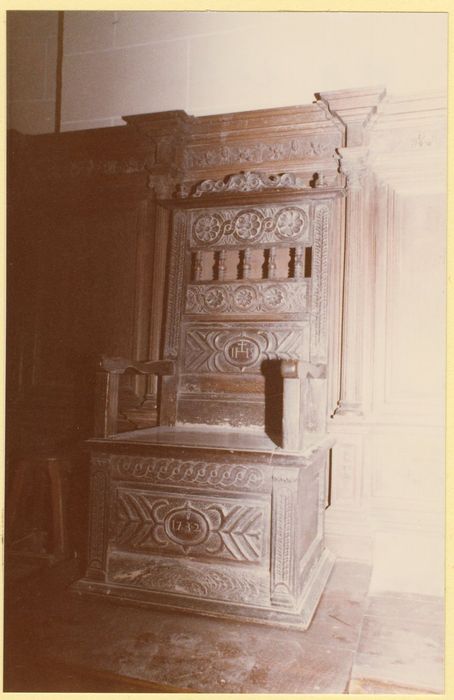 Fauteuil de célébrant de très belle qualité, daté de 1732. Il a été installé dans un ensemble degré-dorsal plus tardif (19e siècle).
