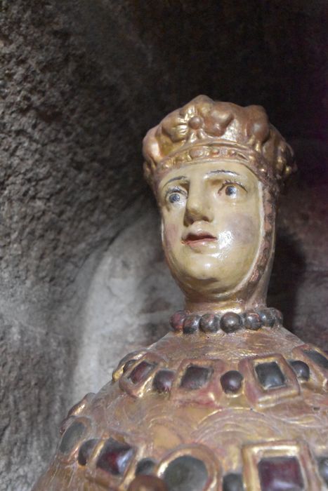 statue en bois polychrome dont la dorure originale est très usée ; entièrement recouverte de bronzine