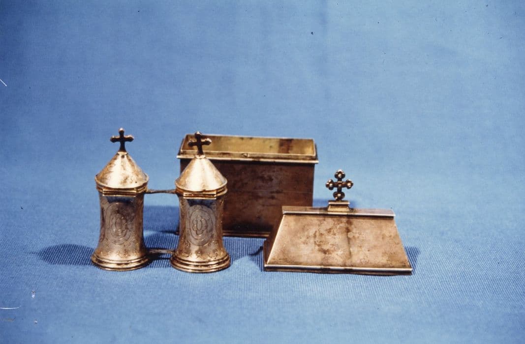 ampoule aux saintes huiles (2) ; coffret aux saintes huiles