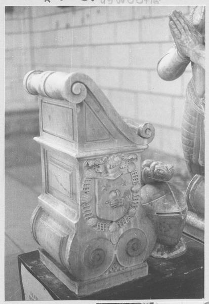 La plate-forme porte une prie-Dieu de marbre blanc sur lequel est placé un livre ouvert. Devant ce prie-Dieu, un coussin sur lequel la statue du personnage, grandeur nature, est à genoux (la tête n'est pas d'origine).