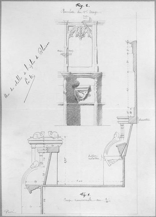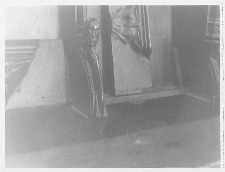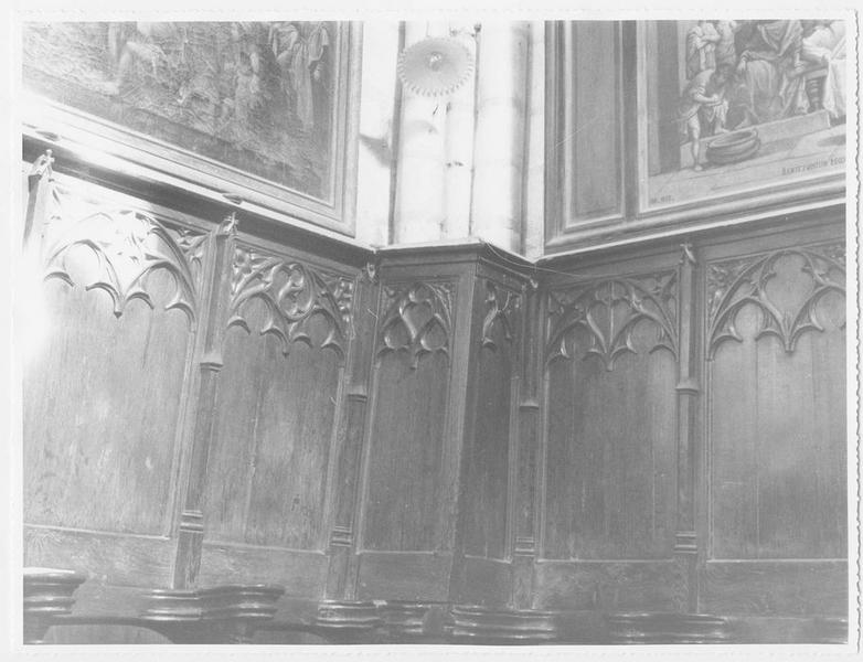 Le dossier est formé d'une arcature gothique. Les miséricordes et les accoudoirs sont ornés de feuillages, d'animaux et de têtes humaines.