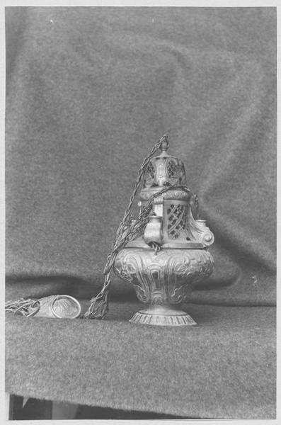 Poinçon de l'orfèvre angevin Pierre II Chesneau : P.C., clé, coeur. Lettre-date : Y couronné (1769 ?). Poinçon de ville : Angers sur trois lignes sous clé (après 1748).