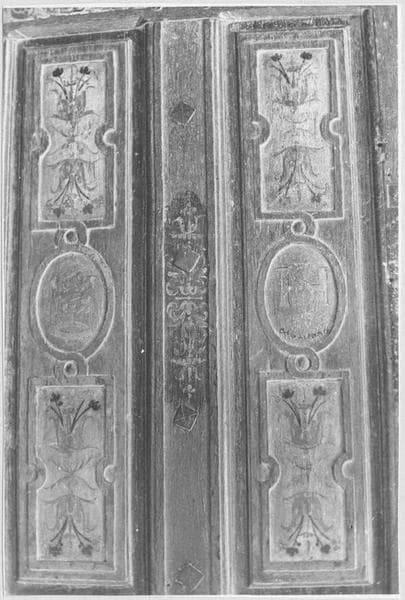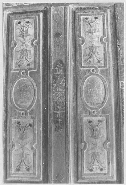 Porte intérieure à un vantail. Porte à six panneaux en hauteur. Panneaux à double table saillante ornés d'un champ plat constituant deux cadres rectangulaires et un cadre ovale par panneau.