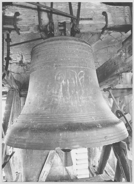 Inscription : LAN 1749 JAI ETE FONDUE AUX FRAIS DES HABITANTS BENIE PAR MRE IAN BAPTISTE RENE LE MOTHEUX PRETRE CURE DE CETTE PSE NOMMEE MAR ANTOINE MARIE PAR HAUT ET PUISSANT SEIGNEUR MONSEIGNEUR ANTOINE LOUIS ROUILLE CHEVALIER SEIGNEUR COMTE DE JOUY ET DE FONTAINE GUERIN ET AUTRES LX MINISTRE SECRETAIRE D'ETAT AU DEPARTEMENT DE LA MARINE ET HAUTE ET PUISSANTE DAME MADAME MARIE CATHERINE PALLU SON EPOUSE REPRENTES PAR MRE CHARLES ANDRE ROLLAND AVOCAT AUX SIEGES ROYAUX DE BEAUFORT ET SENECHAL DES JURIDICTIONS DE MONDIT SGR ET PAR DME MARTHE GUERICHER VEUVE ME JEANCE MOTHEUX VIVANT NOTAIRE ROYAL A BEAUFORT PROCUREURS DES DITS SGR ET DAME A LA DILIGENCE DE MON DIT SR CURE ET DE DENIS CHOISEAU LABOUREUR PR DE FABRIQUE.