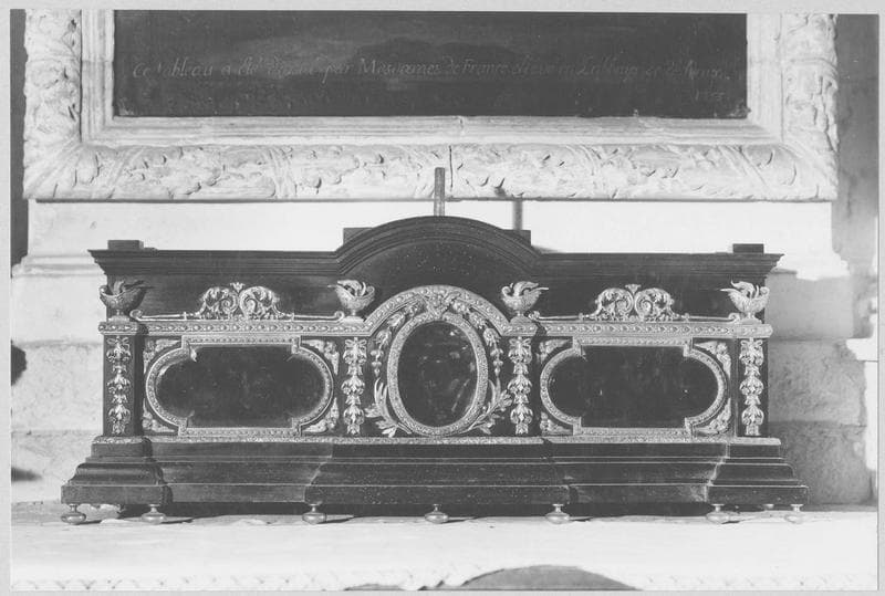 Il comprend trois parties. La partie centrale comporte un médaillon ovale en saillie dont l'entourage de cuivre est entièrement travaillé et dans lequel sont exposées des reliques. Au-dessus, sur la partie arrondie est placée une coupelle permettant de poser un vase, une statue ou un crucifix. Les deux parties de droite et de gauche, rectangulaires sont des vitrines dans lesquelles sont exposées également des reliques. Les trois parties sont limitées par des piliers de cuivre ciselés surmontés chacun d'une lampe d'où sortent des flammes, le tout en cuivre.